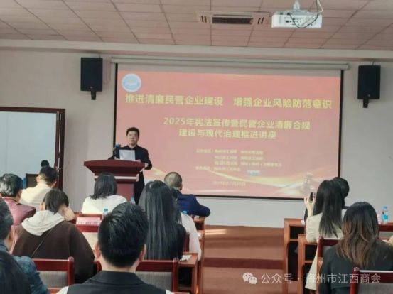 12月23日,由市工商联、市司法局、梅江区工商联、梅县区工商联、梅江区司法局、华商(梅州)律师事务所、梅州市江西商会联合举办的宪法宣传暨民营企业清廉合规建设与现代治理推进讲座在梅州市江西商会会议室举行。梅州市民营企业联络服务中心主任赖展新参加活动并讲话,梅州市工商联党组成员、秘书长王腾飞主持活动,梅州市江西商会执行会长童木连代表商会致辞。